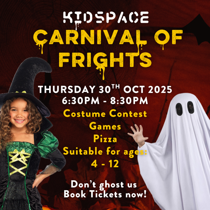 Visit Kidspace on Thursday 30th October between 6:30pm – 8:30pm for a fang-tastic night of tricks, treats, and thrills! For little monsters aged 4-12, expect a spooky costume contest, ghoulish games, and plenty of pizza to keep the fun alive.